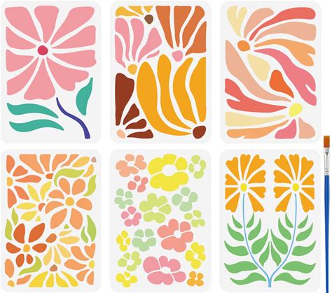 FINGERINSPIRE 6 Pcs Botanical Flower Stencil With A Paint Brush 8.3X11.7Inch Flower Pattern Botanical Texture Stencil Vintage Tropical Floral