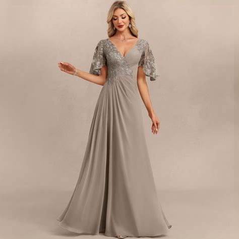 JJ's House Evening Dress Taupe Short Sleeve Long V-Neck A-Line Chiffon 2026